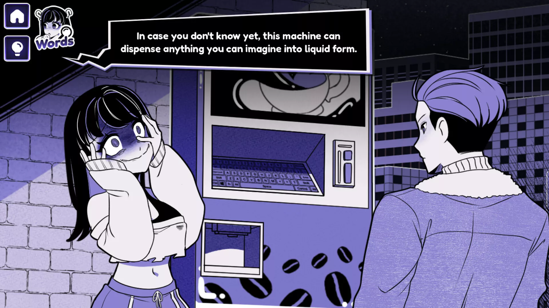 Anomalous Coffee Machine 2 is a strange interactive visual novel and fictional simulation where you stand across from a mysterious girl and an unassuming coffee vending machine capable of producing anything you type, no matter how impossible it seems.