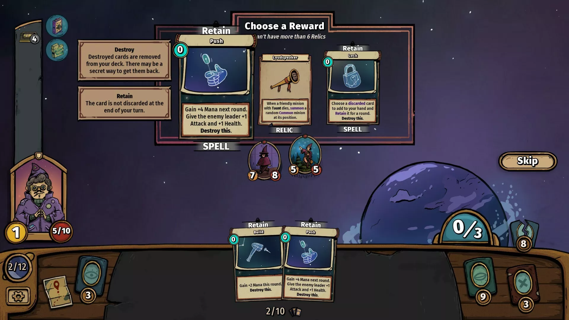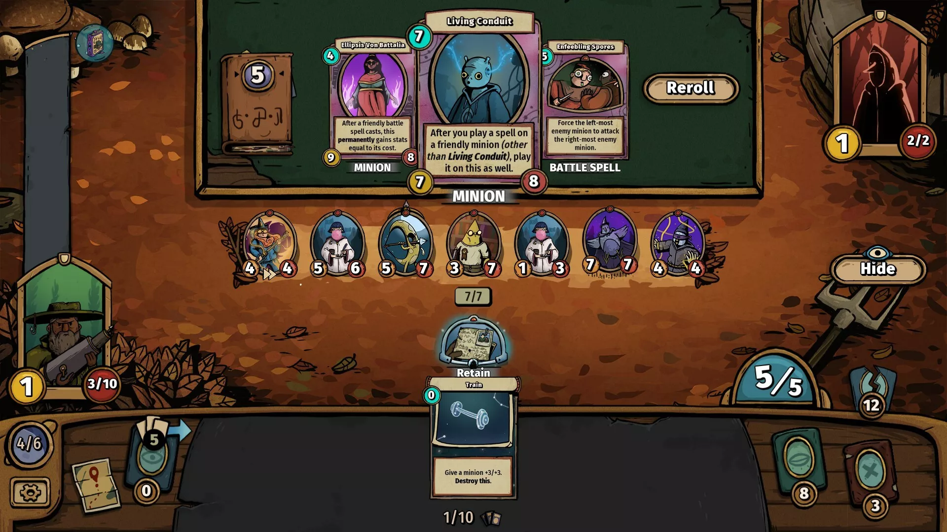Assemble unique decks of minions, spells, and relics. Each round, you’ll be able to draft new cards to grow your arsenal, build overpowered synergies and buff your minions. Collect powerful relics to overclock your deck, and shoot for the stars!