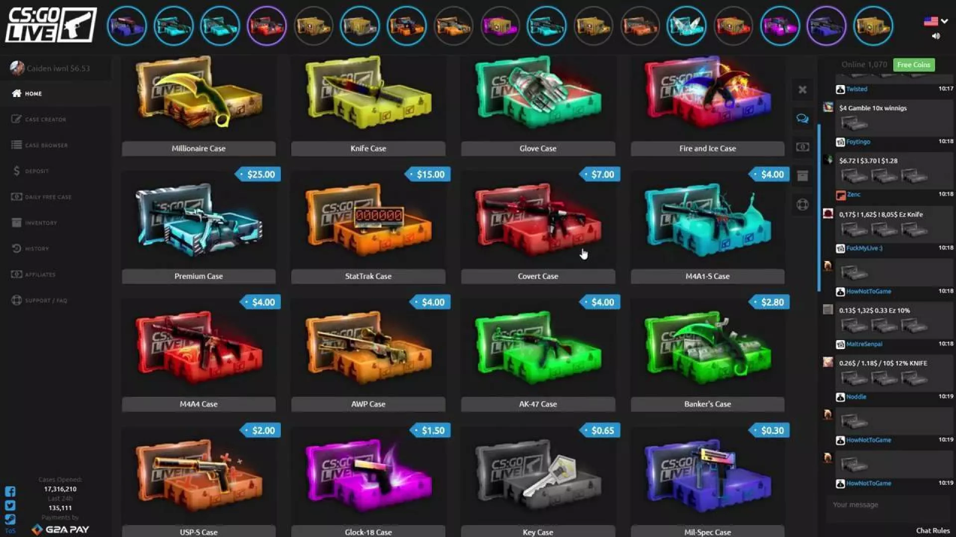 CSGOLive.com is a website for the mythical Counter Strike, CSGO, where you can try your luck in opening all kinds of boxes to receive exclusive and quoted weapons, skins and all kinds of items.