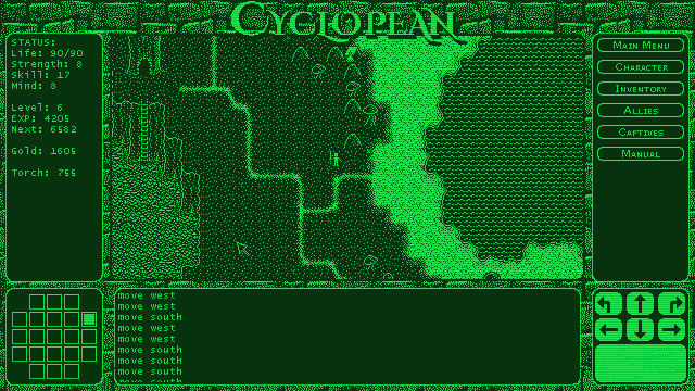Cyclopean follows the tradition of early CRPGs like Ultima, Questron, and Legacy of the Ancients (among others) in that it presents two differing views of the game world. Outside of dungeons, you see your character from the top down in a 2D display of the map. Whereas, in dungeons, the view changes to a 3D, first person perspective.