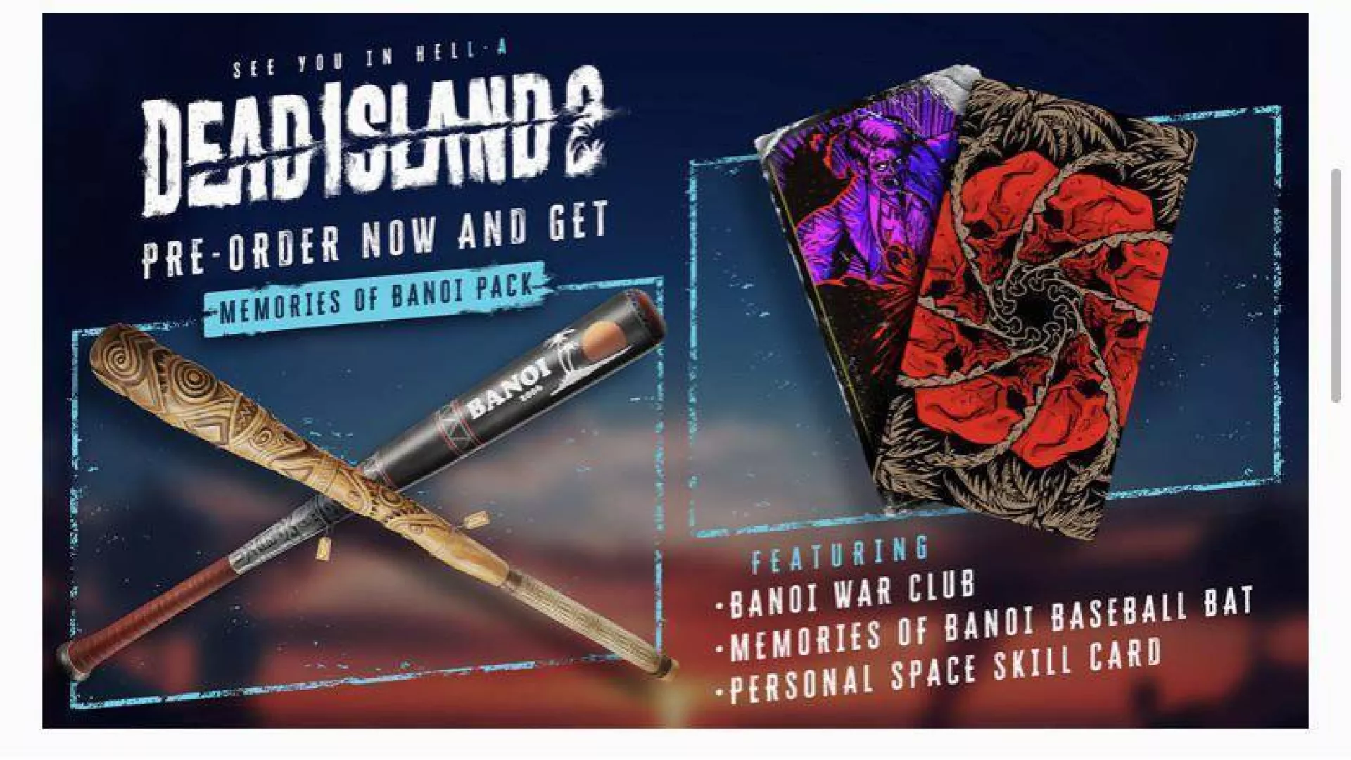 A modest DLC pack that features only fan favorite Banoi weapons: Baseball Bat & War Club, a Perk card, a skill. More simply, while it is a cute nod to the first game, only the mediocre and limited Banoi experience can turn this DLC into only a slight cosmetic & light utility add-on.