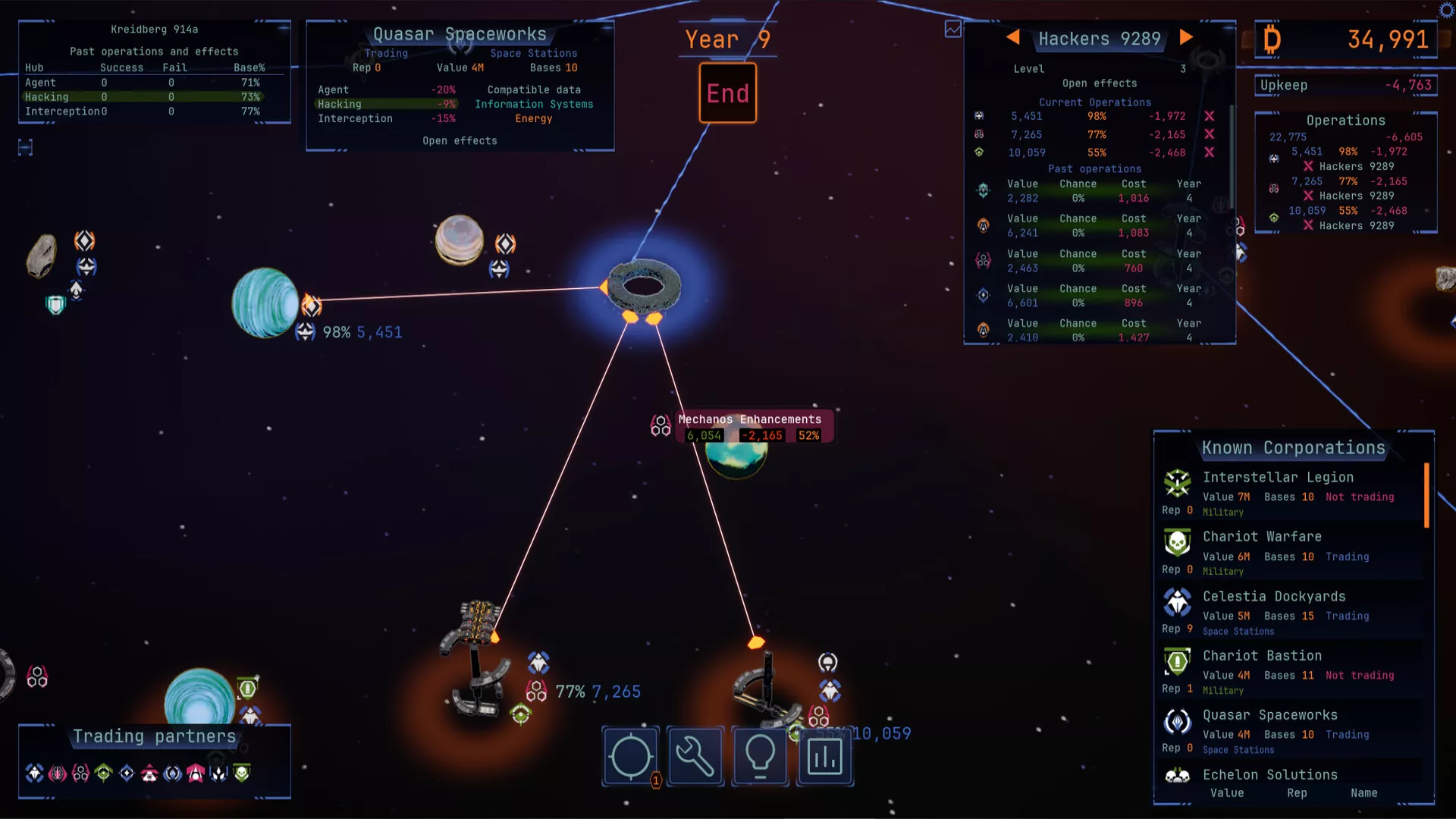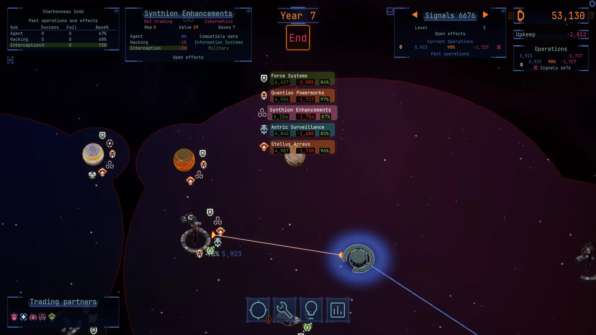 Launch operations from your hubs, target planets and their corporations to steal their data. Target corporations with multiple agents to maximize your success.