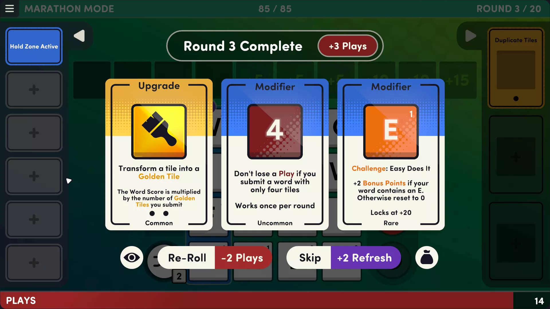 Modifiers change the rules of the game, in your favour. Add more tile spaces, build Bonus Points, make Q tiles become QU tiles, and more.